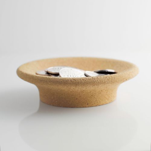 This catchall tray holds keys, coins, & doodads. It's shallow dish if formed for easy grab and go use. The molded cork body offers a satisfying thump instead of a clang.